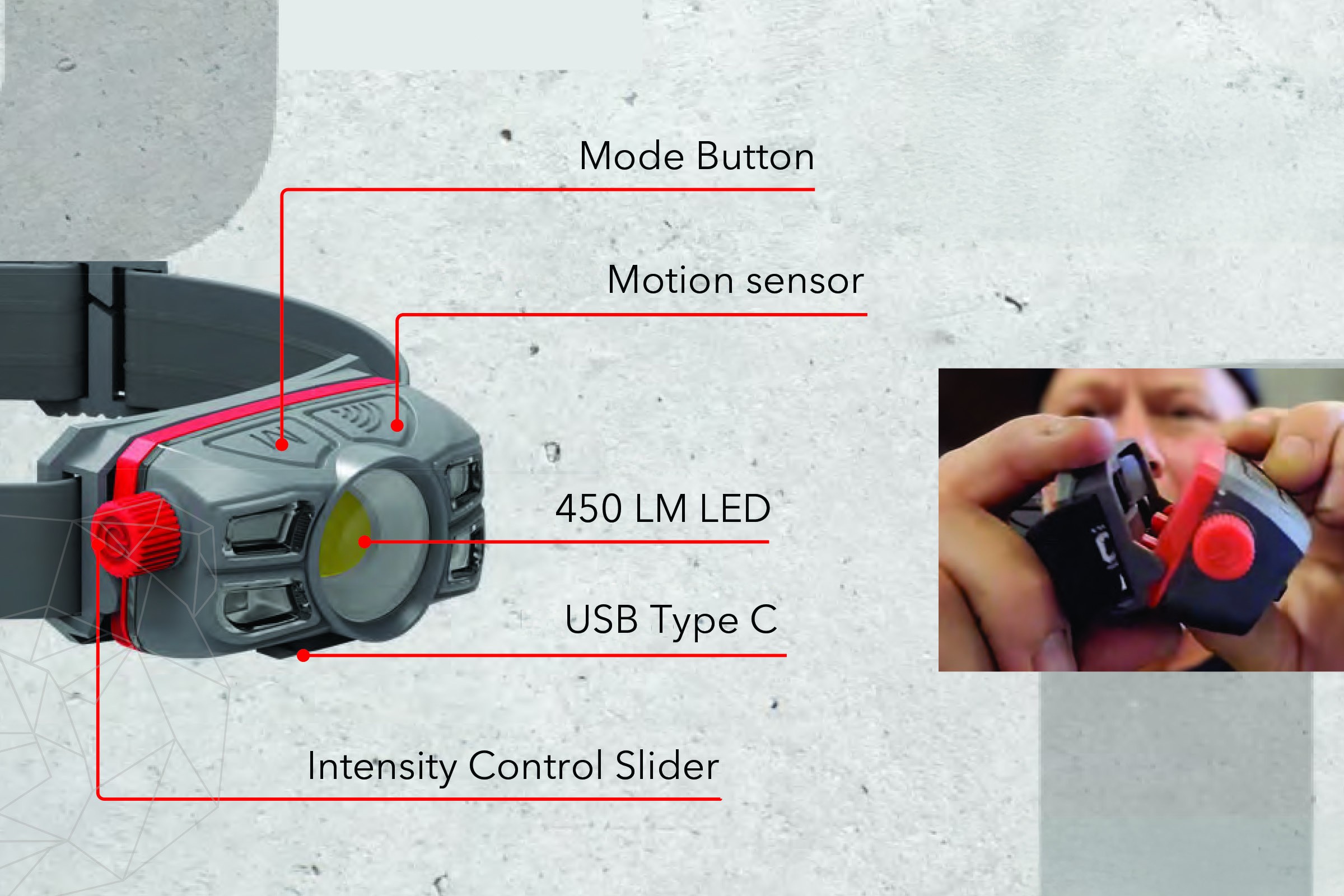 Es verfügt über einen intelligenten Bewegungssensor zur freihändigen Aktivierung und eignet sich daher ideal für Aufgaben, die beide Hände erfordern, oder für eine schnelle und bequeme Bedienung. Der Tragekomfort wird durch ein ergonomisches Kopfband und Silikonbänder optimiert, die auch bei intensiven Bewegungen für perfekten Halt auf dem Kopf sorgen.